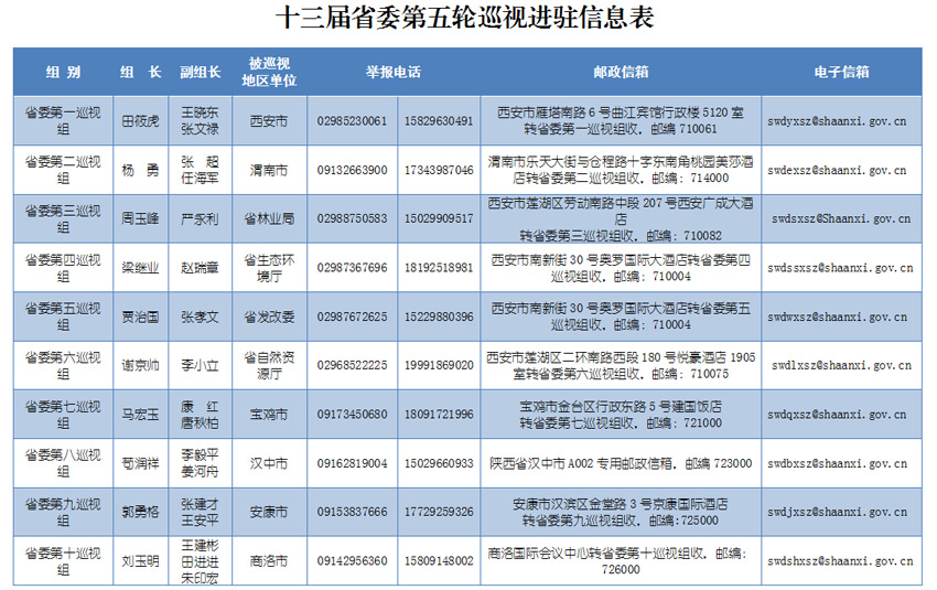根據(jù)安排,省委巡視組將在被巡視地區(qū)、單位工作1個月左右。巡視期間設(shè)值班電話、郵政信箱、電子郵箱等,巡視組受理信訪時間截止到2019年6月30日。省紀委監(jiān)委信訪舉報受理電話(029—12388)、信箱(西安市雁塔區(qū)雁塔路南段十號陜西省紀委監(jiān)委信訪室)和網(wǎng)上舉報窗口(http://shaanxi.12388.gov.cn),同步受理涉及秦嶺生態(tài)環(huán)境保護的信訪舉報。根據(jù)秦嶺生態(tài)環(huán)境保護專項巡視工作要求,省委巡視組主要受理反映被巡視地區(qū)和單位秦嶺生態(tài)環(huán)境保護方面的問題和線索。對不屬于這次專項巡視受理范圍的信訪問題反映,將按規(guī)定轉(zhuǎn)交被巡視地區(qū)或單位和有關(guān)部門認真處理。