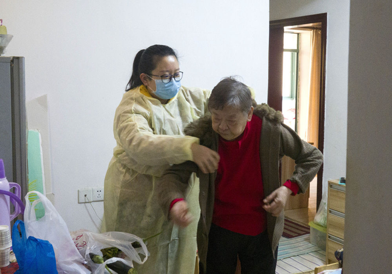 2月5日,武漢市江岸區(qū)永清街道吉林社區(qū)工作人員張敏為老伴住院的獨(dú)居老人送藥。