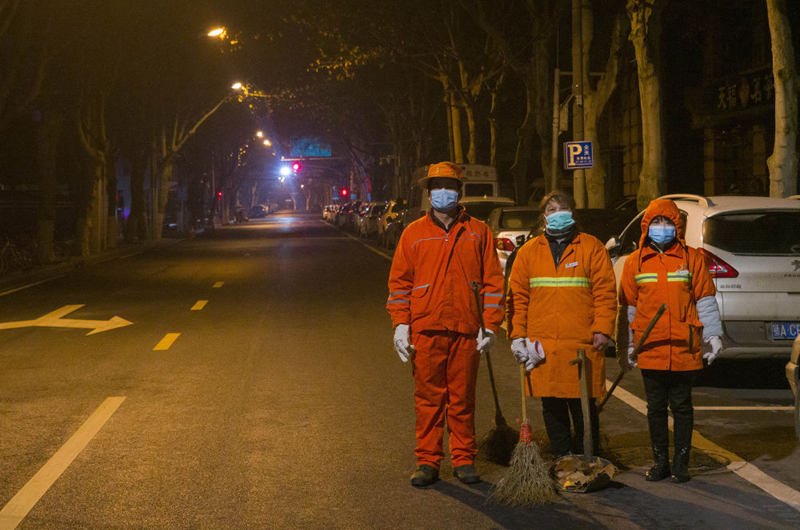 2月3日清晨,三位堅(jiān)守崗位的環(huán)衛(wèi)工人。