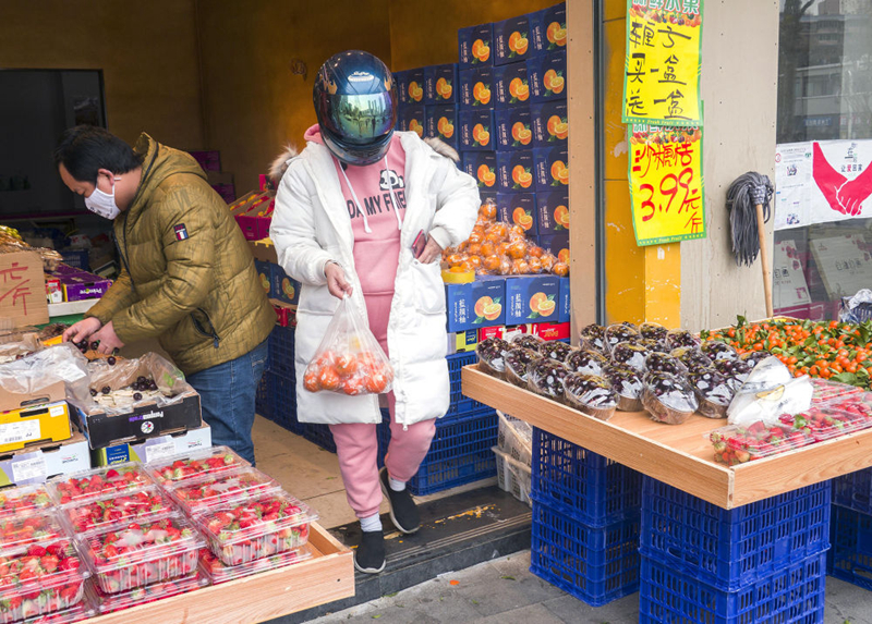 2月8日,在武漢市江漢區(qū),一名女子外面戴著摩托車頭盔,里面戴著口罩在水果店采購(gòu)。