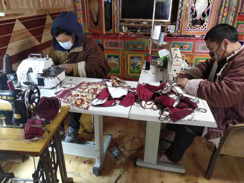 2月5日,四川省金川縣毛日鄉(xiāng)熱它村活動室里一片忙碌景象,紉、剪布料、消毒......二十幾個村民正在有序地縫制口罩。
