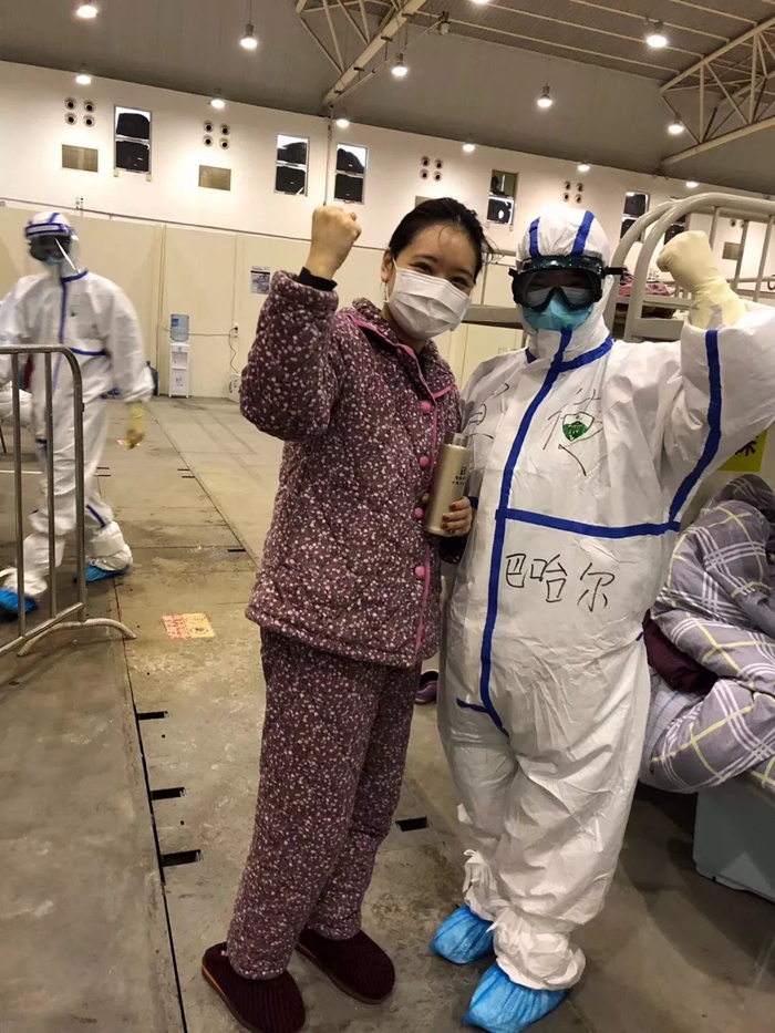 咱們艙里面是輕癥患者,他們特別開心,新疆的古麗來了!他們本來是各種情緒都有,但是我一進去給他們跳舞,他們就覺得放松了。然后又看他們吃飯,陪他們聊天,只要做好防護沒什么可怕的,隔離了那些病菌咱不能隔離愛。