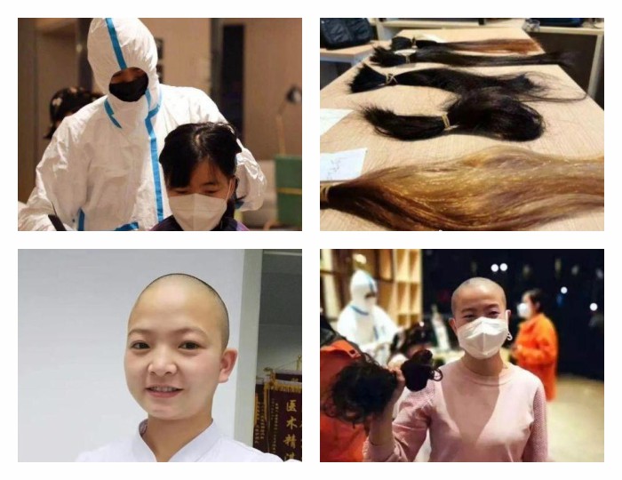 西安國(guó)際中心醫(yī)院醫(yī)療隊(duì)的女醫(yī)護(hù)正在剪發(fā)