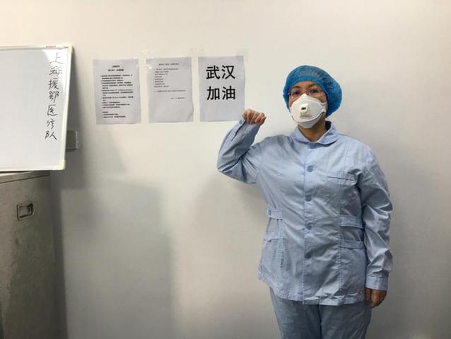 她在“武漢加油”的標(biāo)語(yǔ)前