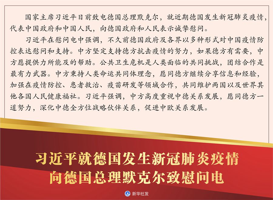 新華社北京3月21日電 國家主席習(xí)近平日前致電德國總理默克爾,就近期德國發(fā)生新冠肺炎疫情,代表中國政府和中國人民,向德國政府和人民表示誠摯慰問。