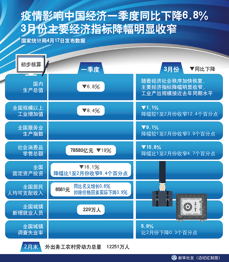 新華社北京4月17日電(記者陳煒偉、安蓓)國家統(tǒng)計局17日發(fā)布數(shù)據(jù),初步核算,一季度國內(nèi)生產(chǎn)總值同比下降6.8%。3月份,隨著經(jīng)濟社會秩序加快恢復(fù),主要經(jīng)濟指標降幅明顯收窄,工業(yè)產(chǎn)出規(guī)模接近去年同期水平。