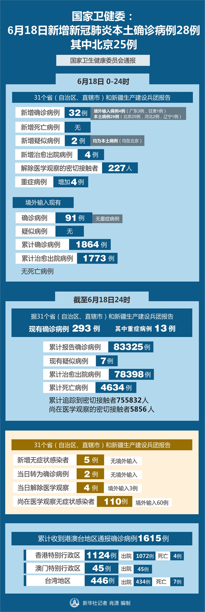 截至6月18日24時,據(jù)31個?。ㄗ灾螀^(qū)、直轄市)和新疆生產(chǎn)建設兵團報告,現(xiàn)有確診病例293例(其中重癥病例13例),累計治愈出院病例78398例,累計死亡病例4634例,累計報告確診病例83325例,現(xiàn)有疑似病例7例。累計追蹤到密切接觸者755832人,尚在醫(yī)學觀察的密切接觸者5856人。