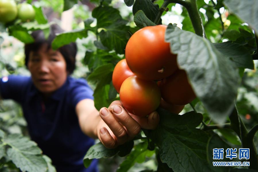 在臨夏回族自治州臨夏縣先鋒鄉(xiāng)前韓村,易地扶貧搬遷戶韓貴蘭在日光溫室內采摘西紅柿(8月11日攝)。新華社記者 陳斌 攝