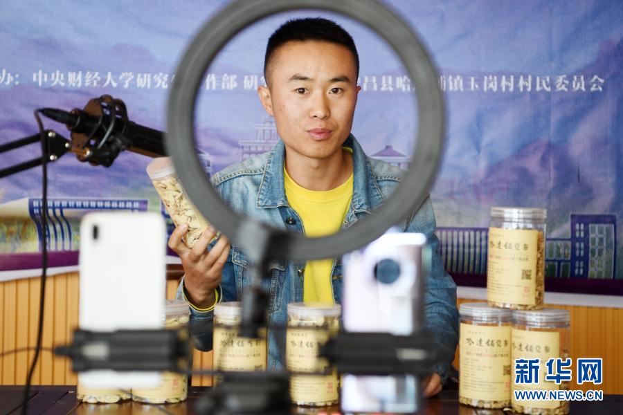 在宕昌縣哈達鋪鎮(zhèn)藥鄉(xiāng)農民專業(yè)合作社聯合社,工作人員網絡直播賣藥材(9月18日攝)。新華社記者 范培珅 攝