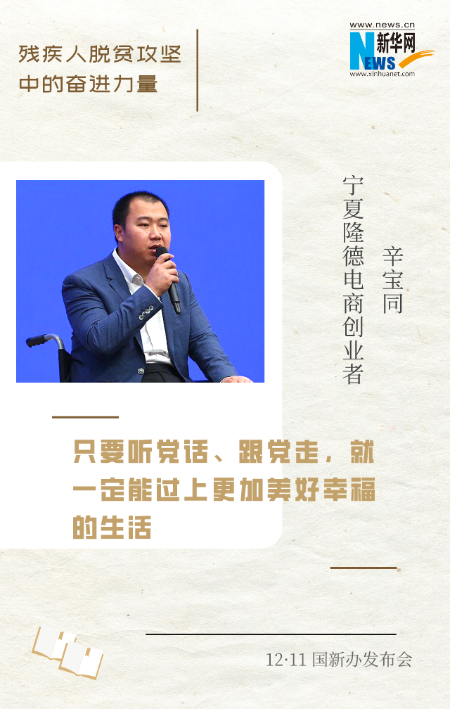 新華網(wǎng)北京12月11日電(王瑩)在脫貧攻堅的戰(zhàn)場上,涌現(xiàn)出許多殘疾人自強脫貧的先進典型和脫貧攻堅一線奮力拼搏的工作者。12月11日上午,國新辦邀請到他們中的4位代表,圍繞“殘疾人脫貧攻堅中的奮進力量”與中外記者見面交流。一起來聽他們的脫貧故事和脫貧經(jīng)驗。