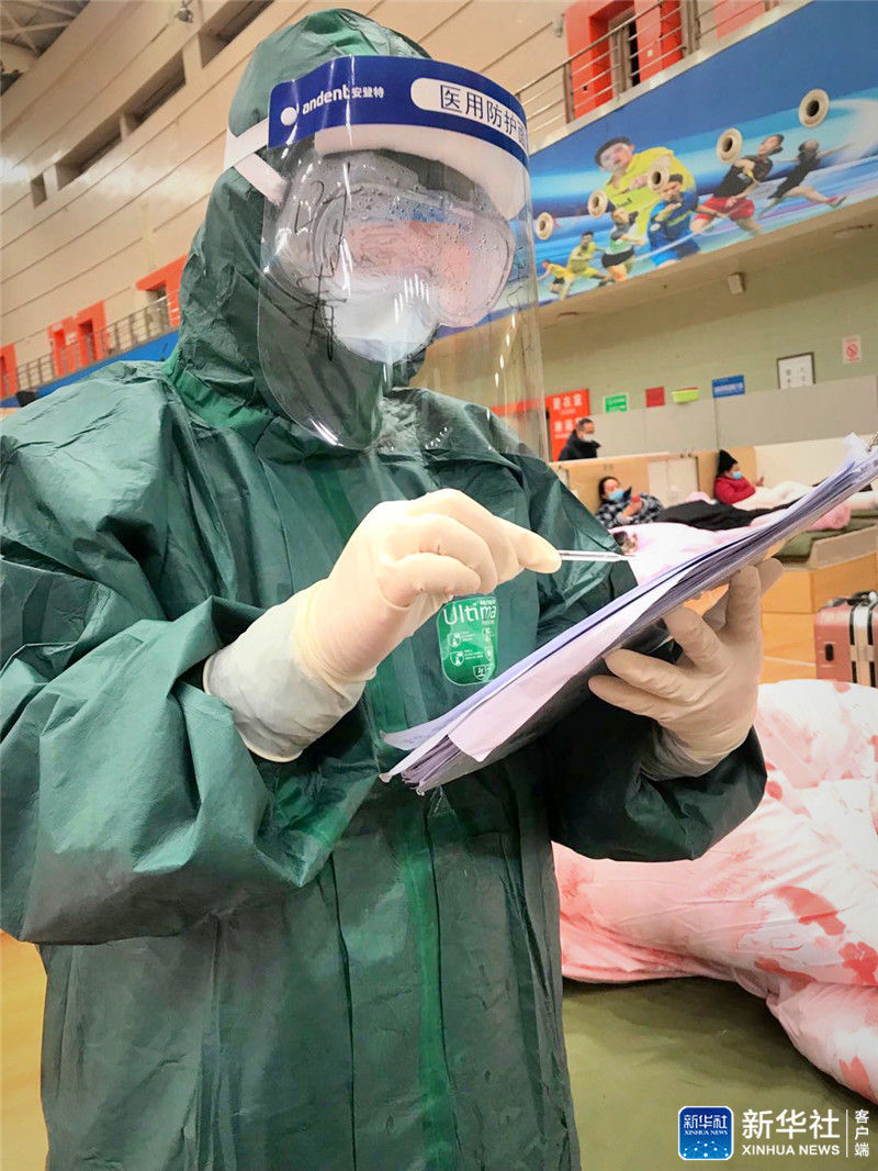國家緊急醫(yī)學救援隊(貴州)隊員葉青在武漢體育中心方艙醫(yī)院內(nèi)工作(資料照片)。新華社發(fā)