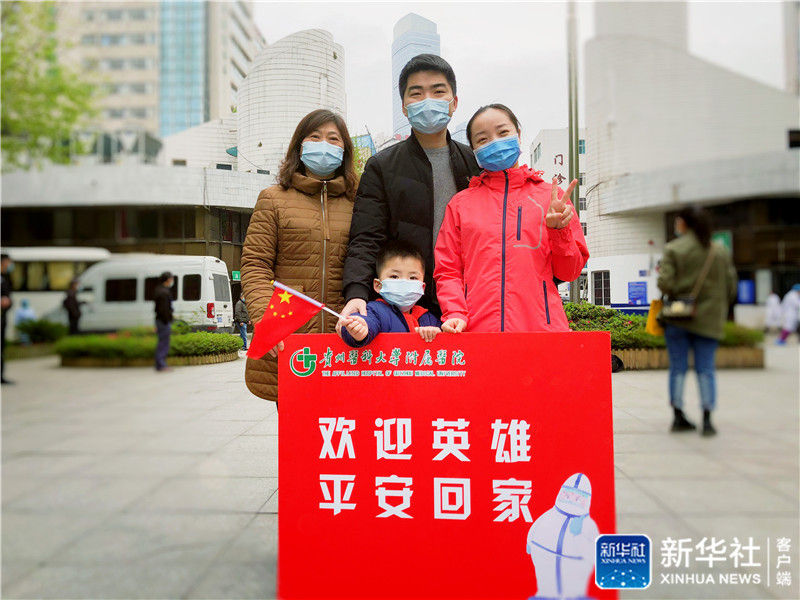 貴州醫(yī)科大學附屬醫(yī)院護士葉青(右一)結(jié)束武漢抗疫工作后回到貴陽和家人合影留念(資料照片)。新華社發(fā)