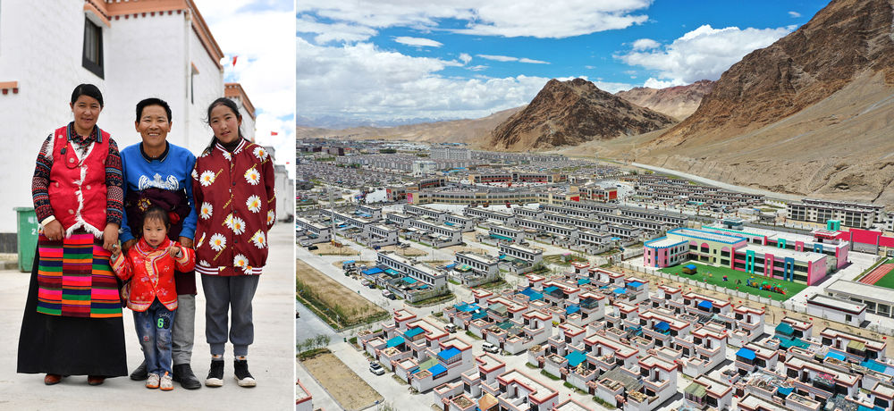拼版照片:左圖為西藏阿里地區(qū)日土縣東汝鄉(xiāng)阿汝村村民丹木真一家在噶爾縣康樂新居易地扶貧搬遷安置點;右圖為該搬遷安置點一角(無人機(jī)照片)。新華社記者 詹彥 攝
