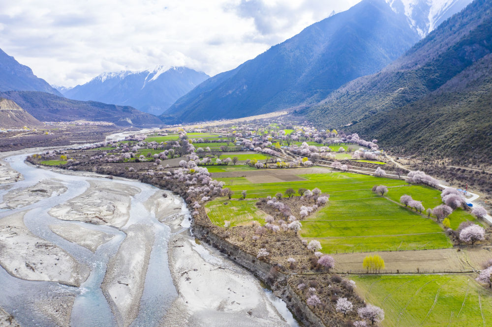 西藏林芝市波密縣境內(nèi)桃花盛開的田園風(fēng)光(3月26日攝,無人機(jī)照片)。新華社記者 普布扎西 攝