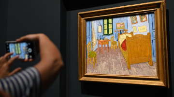 9月1日,参观者在艺术展上展出的摄影作品前驻足观看。