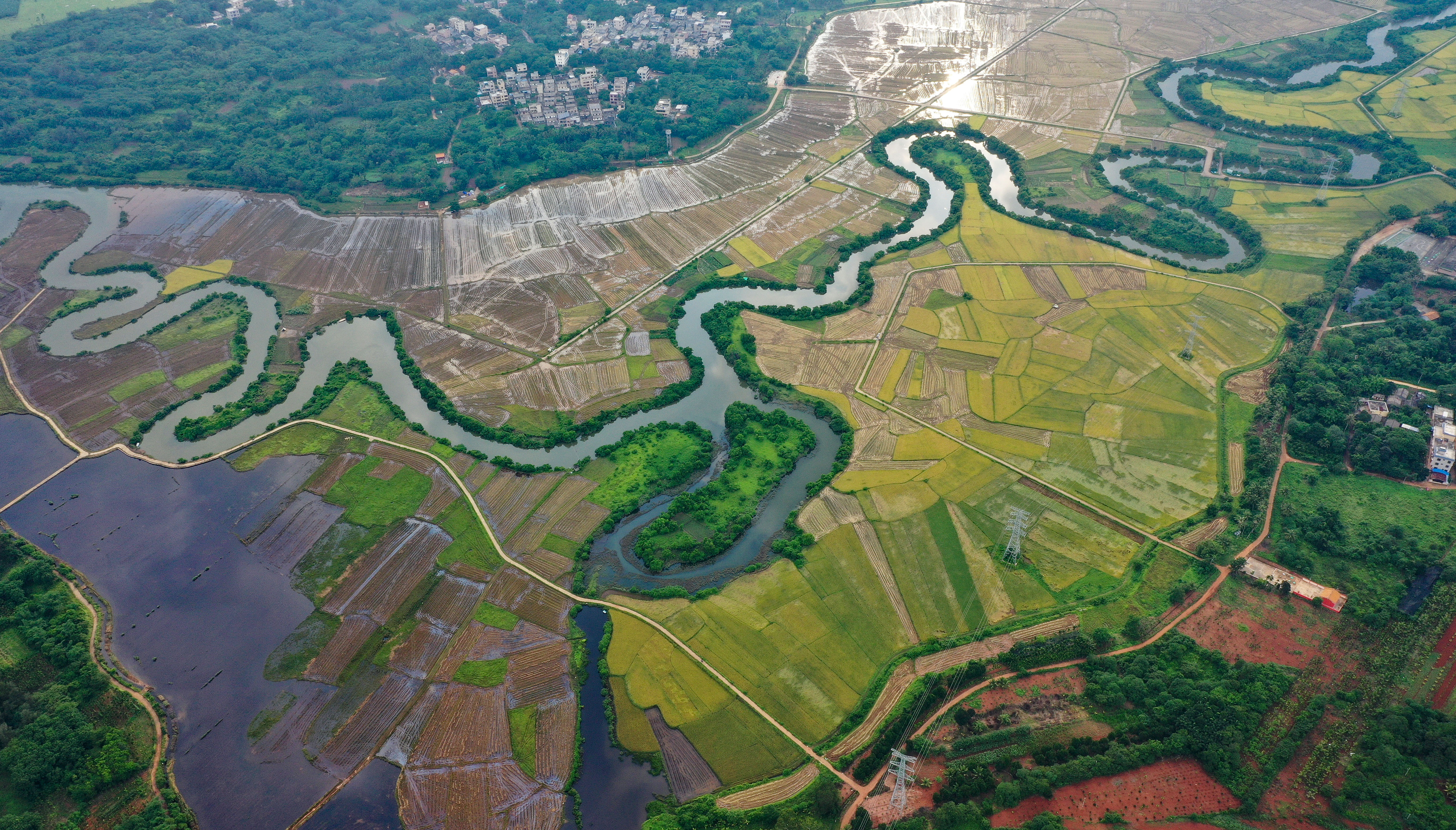 这是5月16日拍摄的海口三十六曲溪两岸的稻田(无人机照片)。新华社记者 郭程 摄