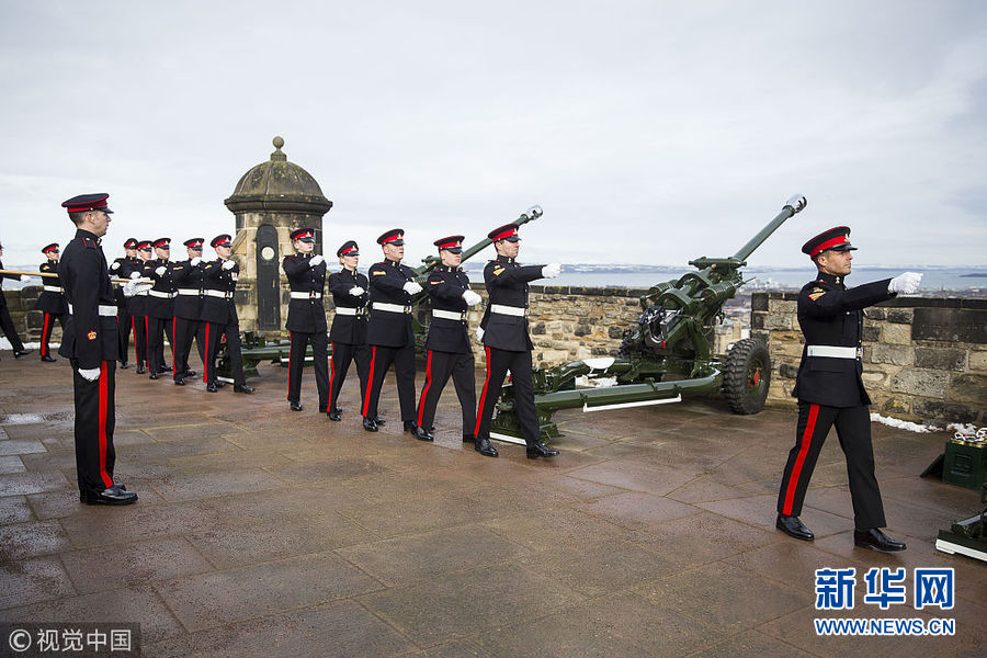 英國皇家炮兵在愛丁堡城堡鳴響21響禮炮 紀(jì)念女王登基66周年