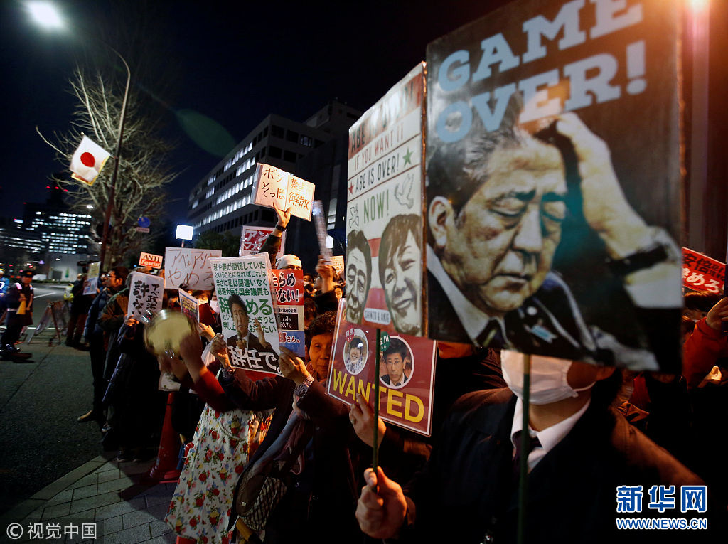 3月12日,日本東京,日本民眾在首相府邸前游行抗議。安倍晉三此前就森友學(xué)園丑聞事件的文件被篡改一事道歉。(圖片來源:視覺中國)
