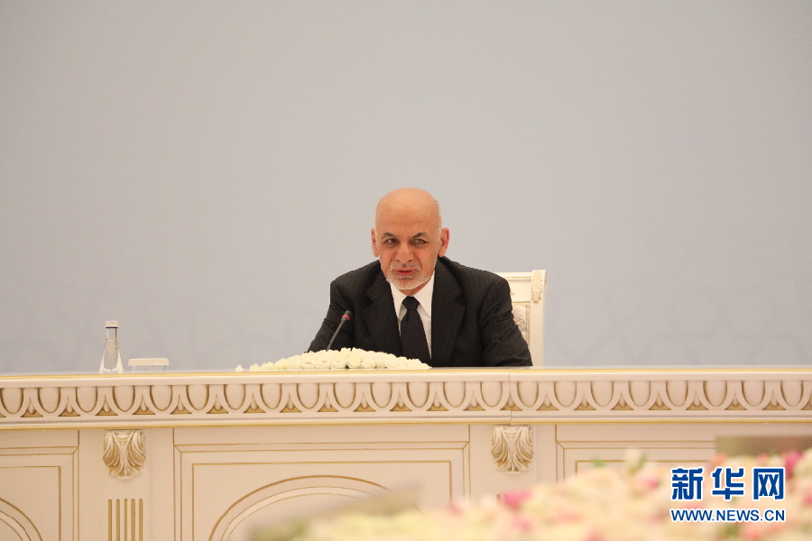 阿富汗總統(tǒng)加尼在會(huì)議上發(fā)言。阿富汗問(wèn)題高級(jí)別會(huì)議27日在烏茲別克斯坦首都塔什干舉行。新華社記者周良攝