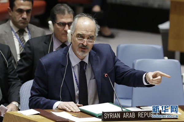 資料圖:2月24日,在位于紐約的聯(lián)合國總部,敘利亞常駐聯(lián)合國代表賈法里(前)在安理會通過敘利亞全境?;饹Q議草案后發(fā)言。新華網(wǎng)記者 李木子 攝