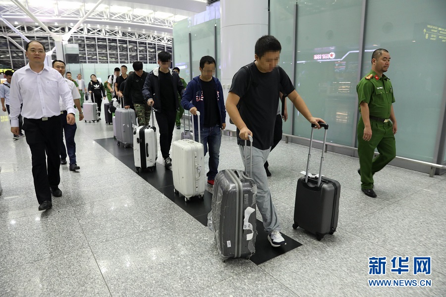 4月28日,嫌疑人在中越警方押送下進入越南河內內排國際機場。當日,越南警方在河內內排國際機場向中國警方工作組移交了許某等8名涉嫌詐騙罪的在逃嫌疑人。中國警方“獵狐行動”在越南再獲新成果。新華社記者王迪攝