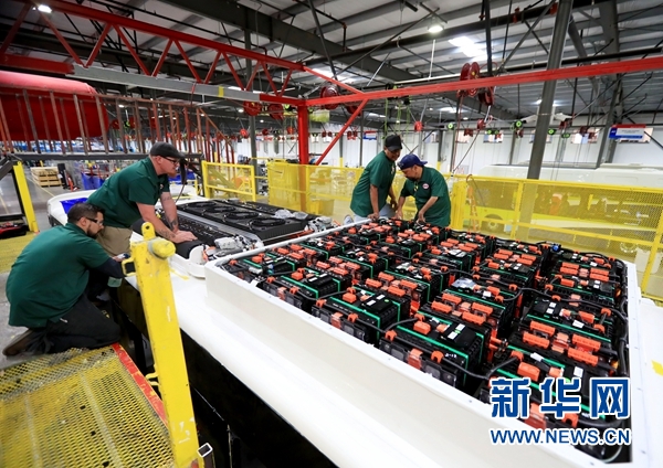 美國工人在比亞迪工廠內(nèi)忙碌。新華網(wǎng)發(fā) 李穎攝