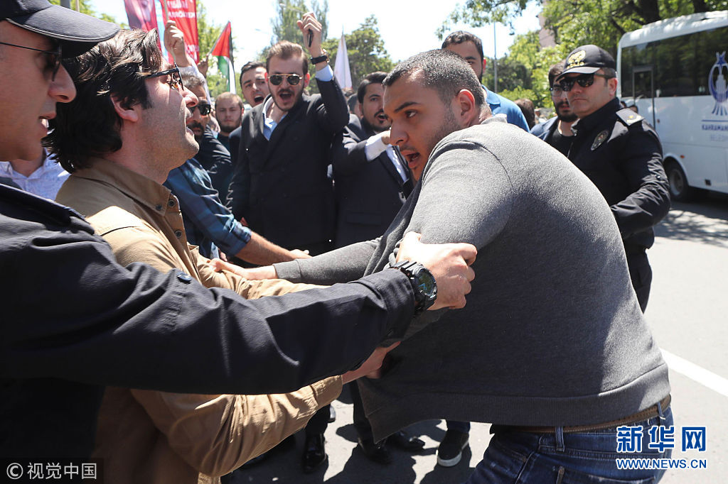 5月15日,土耳其安卡拉,示威者在以色列領(lǐng)事館附近投擲雞蛋和石塊,抗議美國(guó)駐以色列使館遷至耶路撒冷。(圖片來(lái)源:視覺(jué)中國(guó))