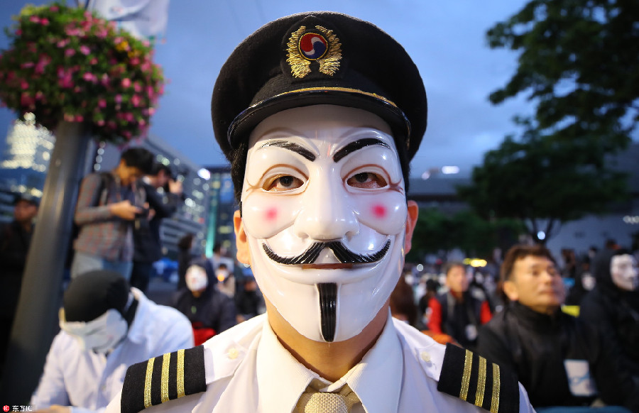 當?shù)貢r間2018年5月18日,韓國首爾,大韓航空有限公司的飛行員戴著蓋伊·??怂姑婢?,在首爾市區(qū)集會抗議,反對大韓航空會長兼首席執(zhí)行官趙亮鎬及其家庭。