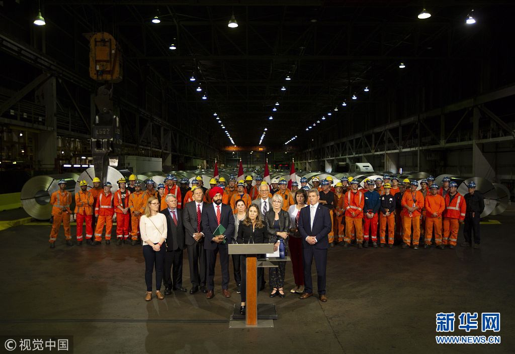 當(dāng)?shù)貢r間2018年6月29日,加拿大漢密爾頓,加拿大外交部長弗里蘭、經(jīng)濟(jì)發(fā)展部長貝恩斯和勞工部長哈伊杜造訪斯特爾科鋼鐵公司,并共同宣布從7月1日起,加拿大將對約126億美元從美國進(jìn)口的商品加征關(guān)稅,以報復(fù)特朗普政府對加拿大鋼鋁產(chǎn)品加征關(guān)稅。他們還表示,加拿大政府將向本國鋼鋁產(chǎn)業(yè)和制造業(yè)提供約15億美元財政援助。(圖片來源:視覺中國)
