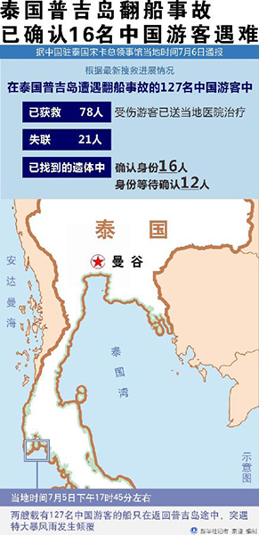 新華社泰國(guó)普吉7月6日電(記者顏昊 楊舟)據(jù)中國(guó)駐泰國(guó)宋卡總領(lǐng)事館6日通報(bào),根據(jù)最新搜救進(jìn)展情況,在泰國(guó)普吉島遭遇翻船事故的127名中國(guó)游客中,已有78人獲救,確認(rèn)16人遇難。