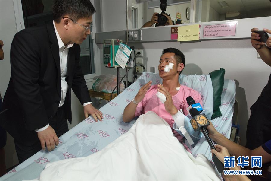 7月7日凌晨,在泰國普吉島,翻船事故幸存者黃俊雄向中國駐泰國大使呂?。ㄗ螅┗貞浱由?jīng)歷。新華社記者秦晴 攝