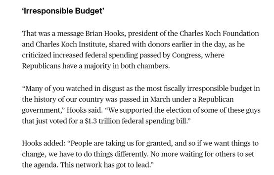另外,科赫兄弟還表示他們不會(huì)再像以前那樣輕易支持共和黨的議員了,因?yàn)檫@些議員并沒(méi)有履行他們競(jìng)選時(shí)的承諾,反而是一直在支持美國(guó)政府的一些違背市場(chǎng)的政策,比如在今年3月的一項(xiàng)加大政府財(cái)政開(kāi)支的法案。