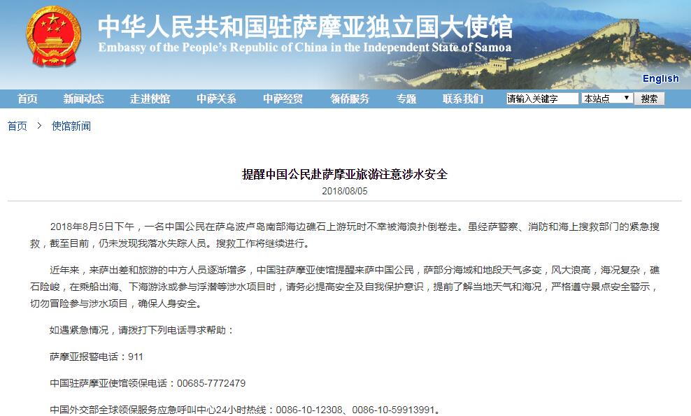 據(jù)中國駐薩摩亞大使館網(wǎng)站消息,當?shù)貢r間2018年8月5日下午,一名中國公民在薩烏波盧島南部海邊礁石上游玩時不幸被海浪撲倒卷走。雖經(jīng)薩警察、消防和海上搜救部門的緊急搜救,截至目前,仍未發(fā)現(xiàn)落水失蹤人員。搜救工作將繼續(xù)進行。