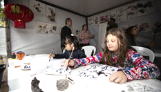 圍繞著中央舞臺,剪紙、書法、針灸等展位前人頭攢動,吸引了許多聞訊而來的華僑華人和當?shù)孛癖?。巴西瓦加斯基金會華人教授夏華聲帶著兩個兒子前來參加活動。