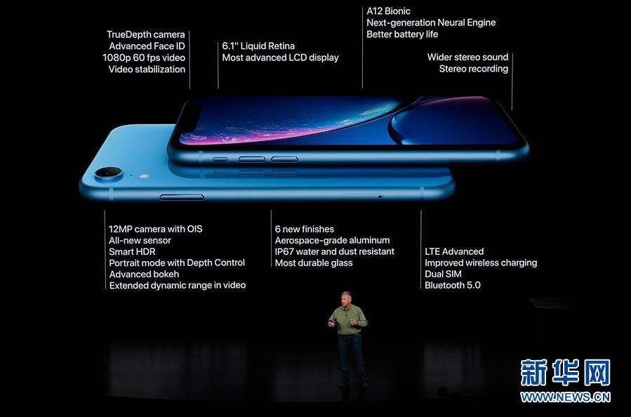 9月12日,在美國(guó)加利福尼亞州丘珀蒂諾市舉行的蘋(píng)果新品發(fā)布會(huì)上,蘋(píng)果公司全球市場(chǎng)營(yíng)銷高級(jí)副總裁菲利普·席勒介紹新推出的蘋(píng)果手機(jī)iPhone XR。新華社發(fā)