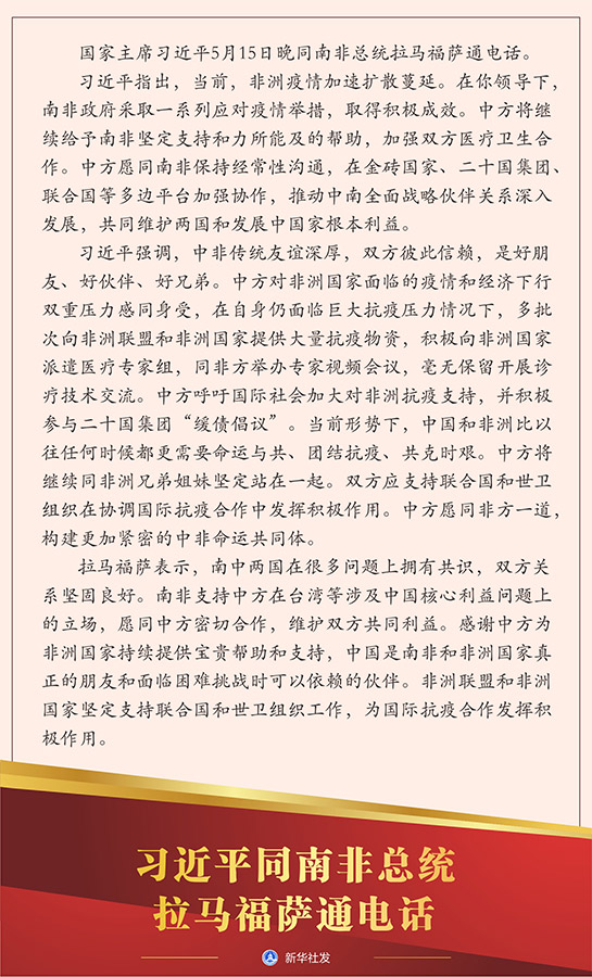 習(xí)近平指出,當(dāng)前,非洲疫情加速擴(kuò)散蔓延。在你領(lǐng)導(dǎo)下,南非政府采取一系列應(yīng)對(duì)疫情舉措,取得積極成效。中方將繼續(xù)給予南非堅(jiān)定支持和力所能及的幫助,加強(qiáng)雙方醫(yī)療衛(wèi)生合作。中方愿同南非保持經(jīng)常性溝通,在金磚國家、二十國集團(tuán)、聯(lián)合國等多邊平臺(tái)加強(qiáng)協(xié)作,推動(dòng)中南全面戰(zhàn)略伙伴關(guān)系深入發(fā)展,共同維護(hù)兩國和發(fā)展中國家根本利益。