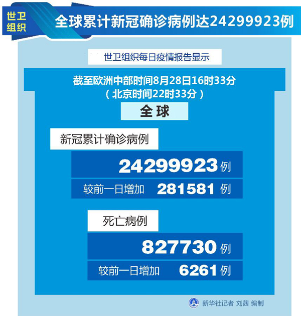 世衛(wèi)組織網(wǎng)站最新數(shù)據(jù)顯示,截至歐洲中部時(shí)間28日16時(shí)33分(北京時(shí)間22時(shí)33分),全球確診病例較前一日增加281581例,達(dá)到24299923例;死亡病例增加6261例,達(dá)到827730例。