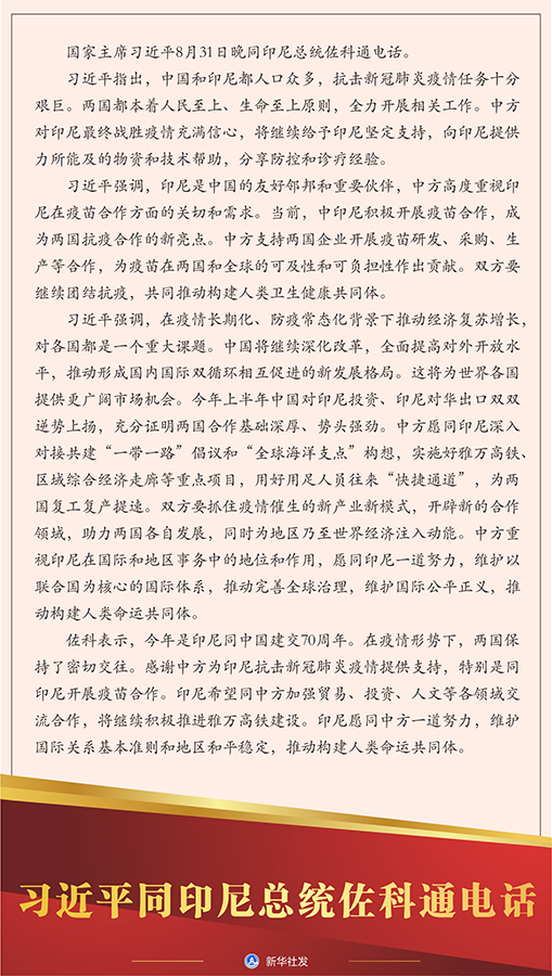 習(xí)近平指出,中國(guó)和印尼都人口眾多,抗擊新冠肺炎疫情任務(wù)十分艱巨。兩國(guó)都本著人民至上、生命至上原則,全力開展相關(guān)工作。中方對(duì)印尼最終戰(zhàn)勝疫情充滿信心,將繼續(xù)給予印尼堅(jiān)定支持,向印尼提供力所能及的物資和技術(shù)幫助,分享防控和診療經(jīng)驗(yàn)。