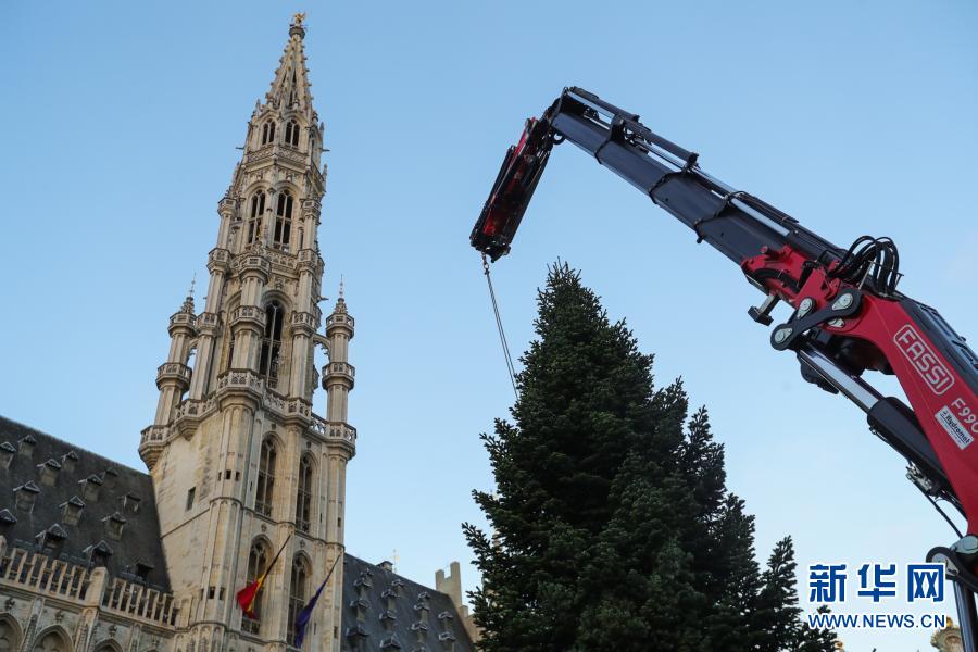 這是11月19日在比利時布魯塞爾大廣場拍攝的圣誕樹安裝現(xiàn)場。