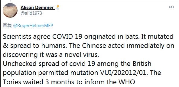 還有一名網(wǎng)友對比稱:“科學家同意新冠病毒起源自蝙蝠,變異后傳播給人類,中國人發(fā)現(xiàn)這是一種新病毒后,立即采取了行動。新冠病毒在英國人口中無限制的傳播,導致了變異新冠病毒(VUI/202012/01),保守黨等了3個月才通知世衛(wèi)組織?!?/p>
