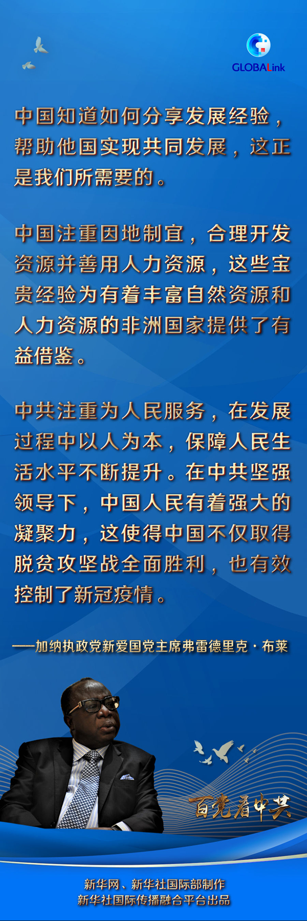 布萊對(duì)中國(guó)共產(chǎn)黨成立100周年表示祝賀。他祝愿中國(guó)在中共領(lǐng)導(dǎo)下取得更多成功,促進(jìn)世界和平繁榮穩(wěn)定,同時(shí)希望加納新愛(ài)國(guó)黨和中共在未來(lái)能有更多交流合作。